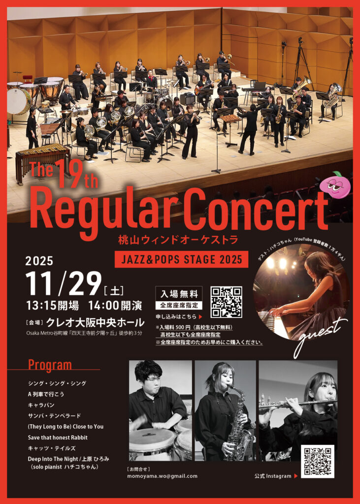 第19回になった桃山ウィンドオーケストラ単独レギュラーコンサート、今年もクレオ大阪中央ホールで開催いたします!